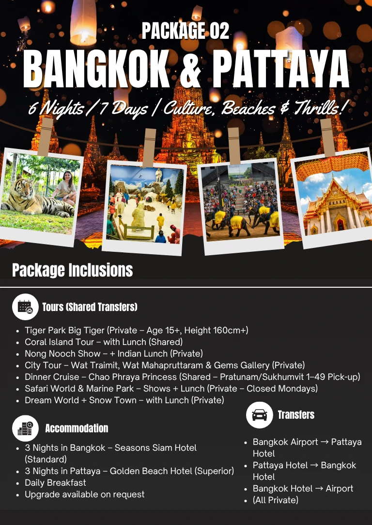 Explore the vibrant city life of Bangkok and the beachside charm of Pattaya in this 7-day package. Enjoy a combination of cultural tours, wildlife adventures, and theme park fun, with comfortable stays in both cities and convenient private transfers.